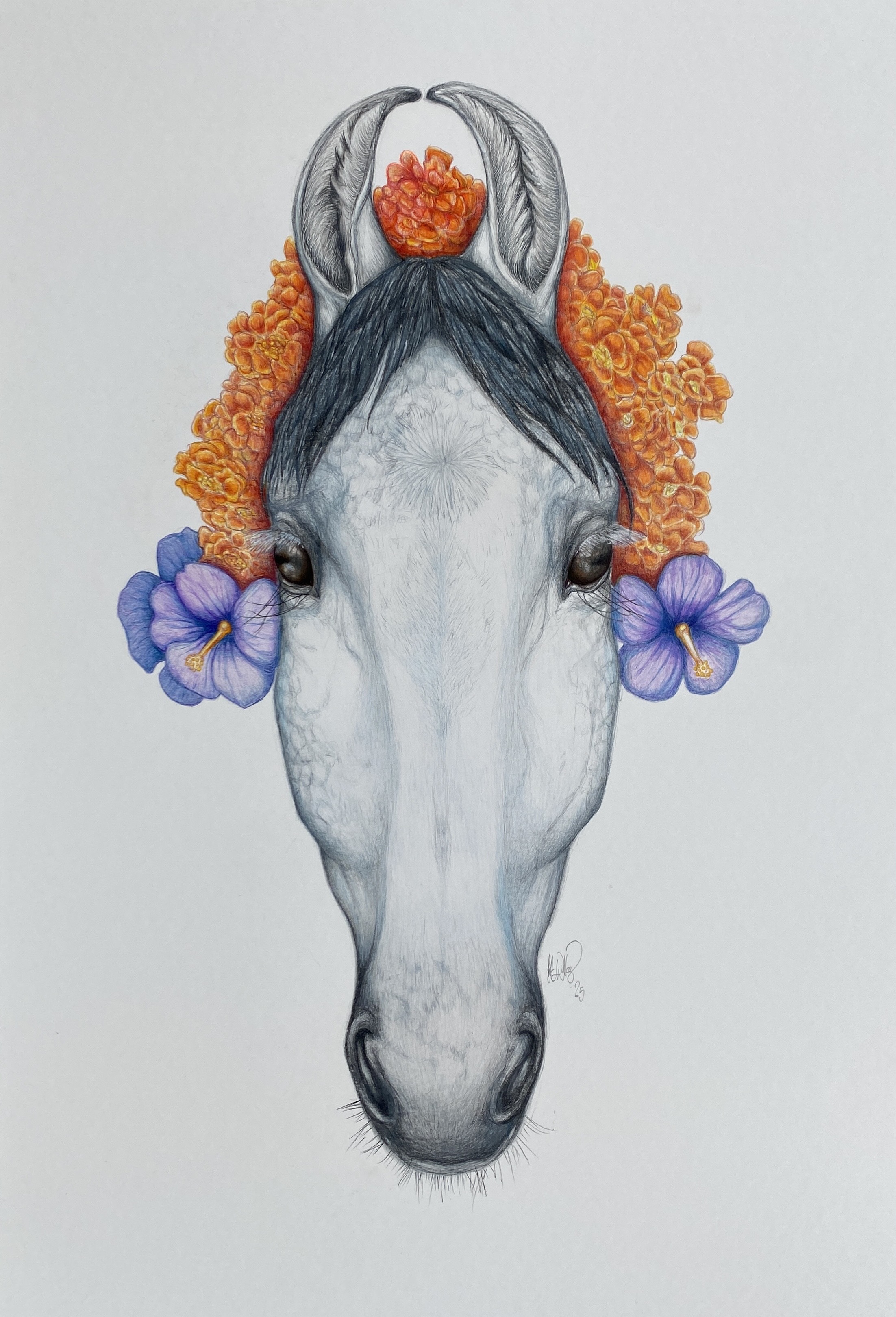 - Marwari horse (Equus ferus cabollis) adorned with marigold and hibiscus. 20×30. $500. Equine and floral symmetry.