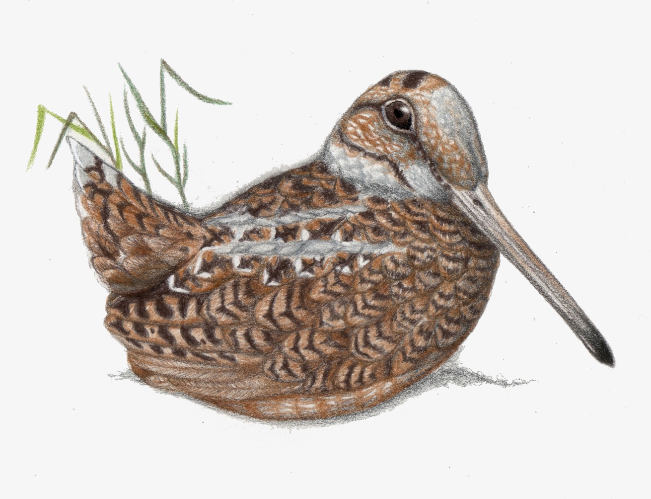 - American woodcock (Scolopax minor). 9×12. $200. Folk names include timberdoodle, bogsucker, night partridge, brush snipe, hokumpoke, becasse, twitterpate, little gomer, fiddle squeak, worm sabre, wafflebird, whipperwon’t, bumblebee chicken, billdad, mud needle, prairie turtle, and crazy straw.