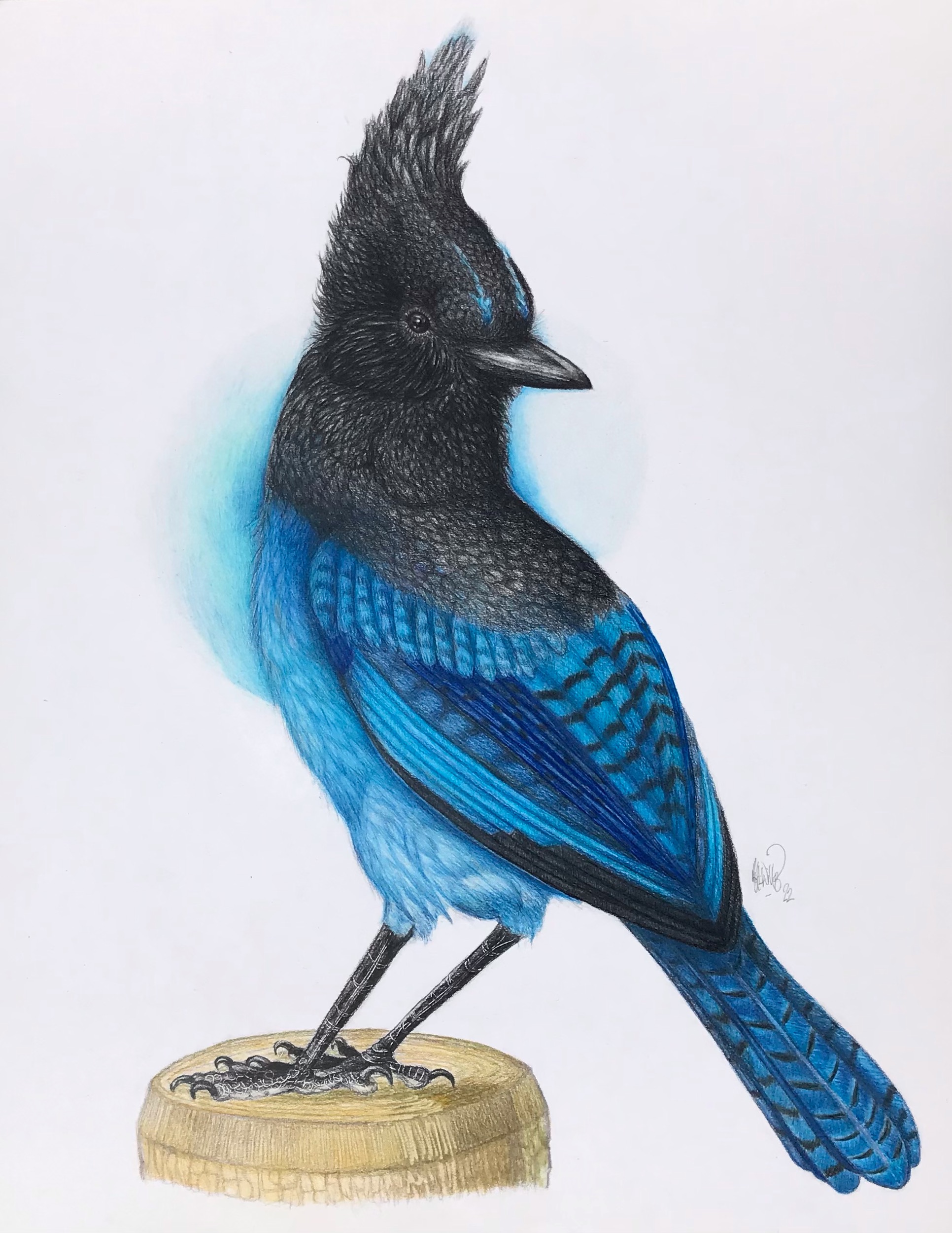 - Stellers jay (Cyanocitta stelleri). 14×17. Neighbourhood scold. >SOLD<
