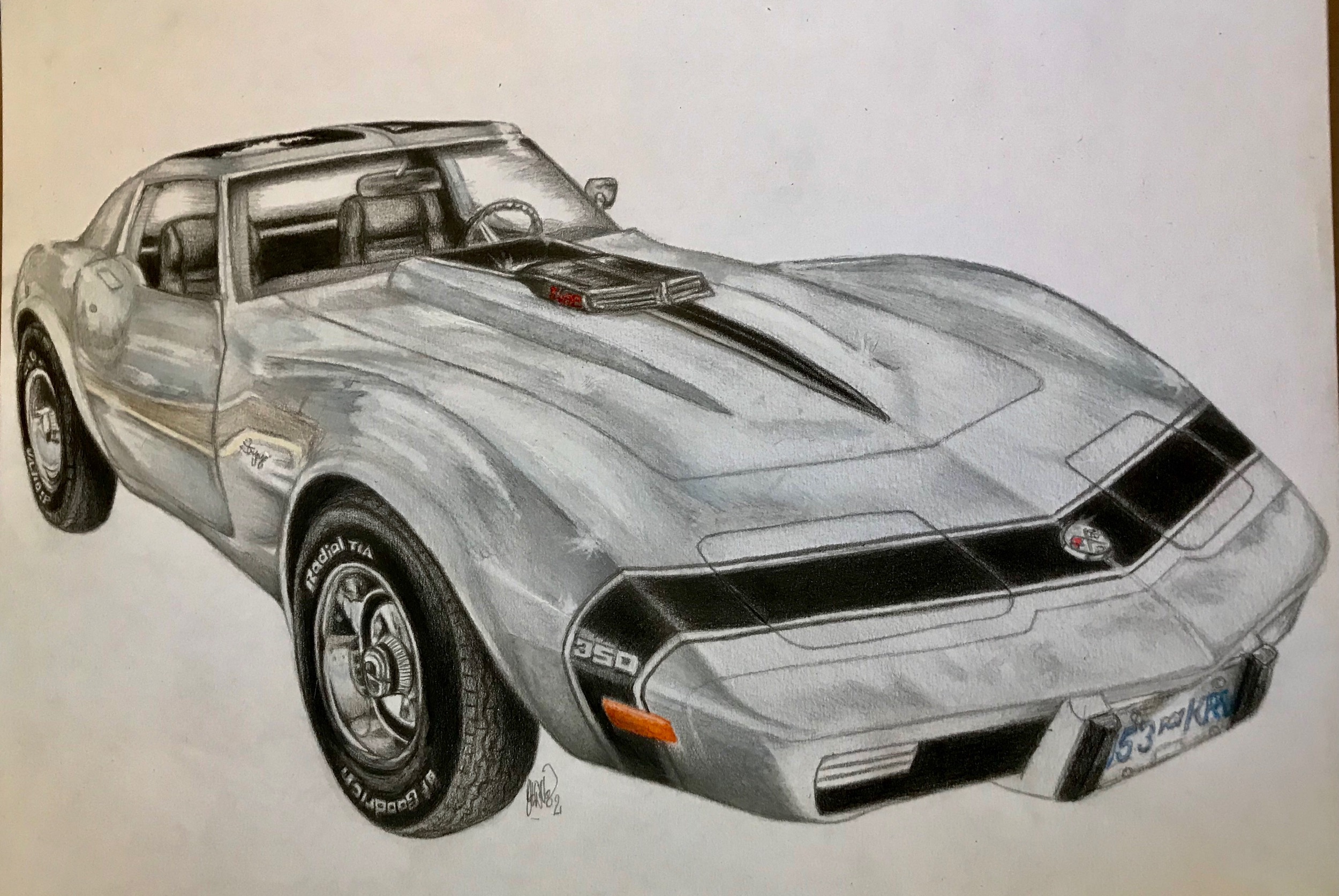 - 1975 L82 Corvette Stingray. Sufficiently feline to hide among the creatures. Graphite, coloured pencil, ink on Bristol board. 11×14.