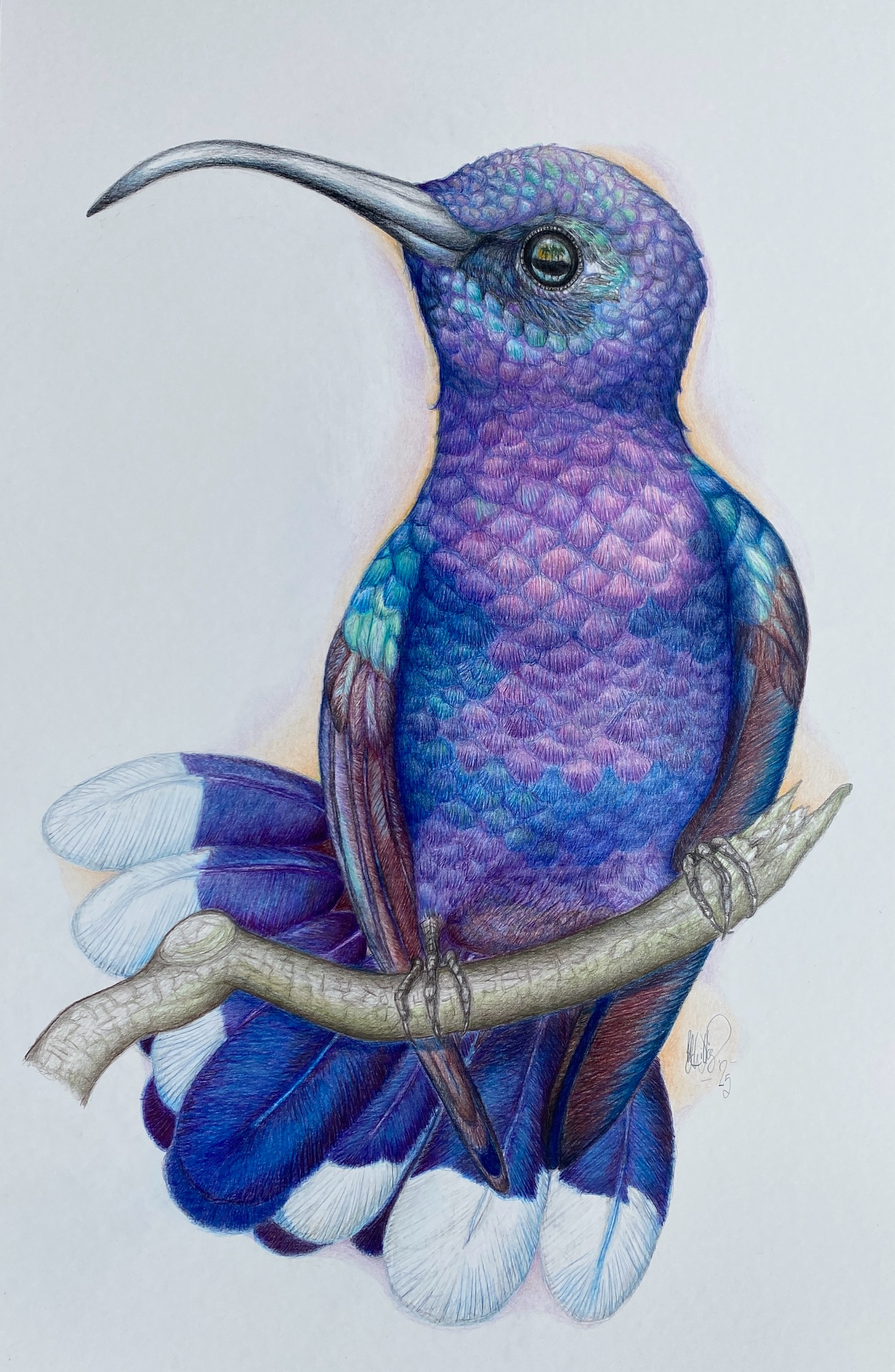 - Violet sabrewing (Campylopterus hemileucurus). Grape shimmer. Graphite, coloured pencil, iridescent ink on Bristol board. 20×30.