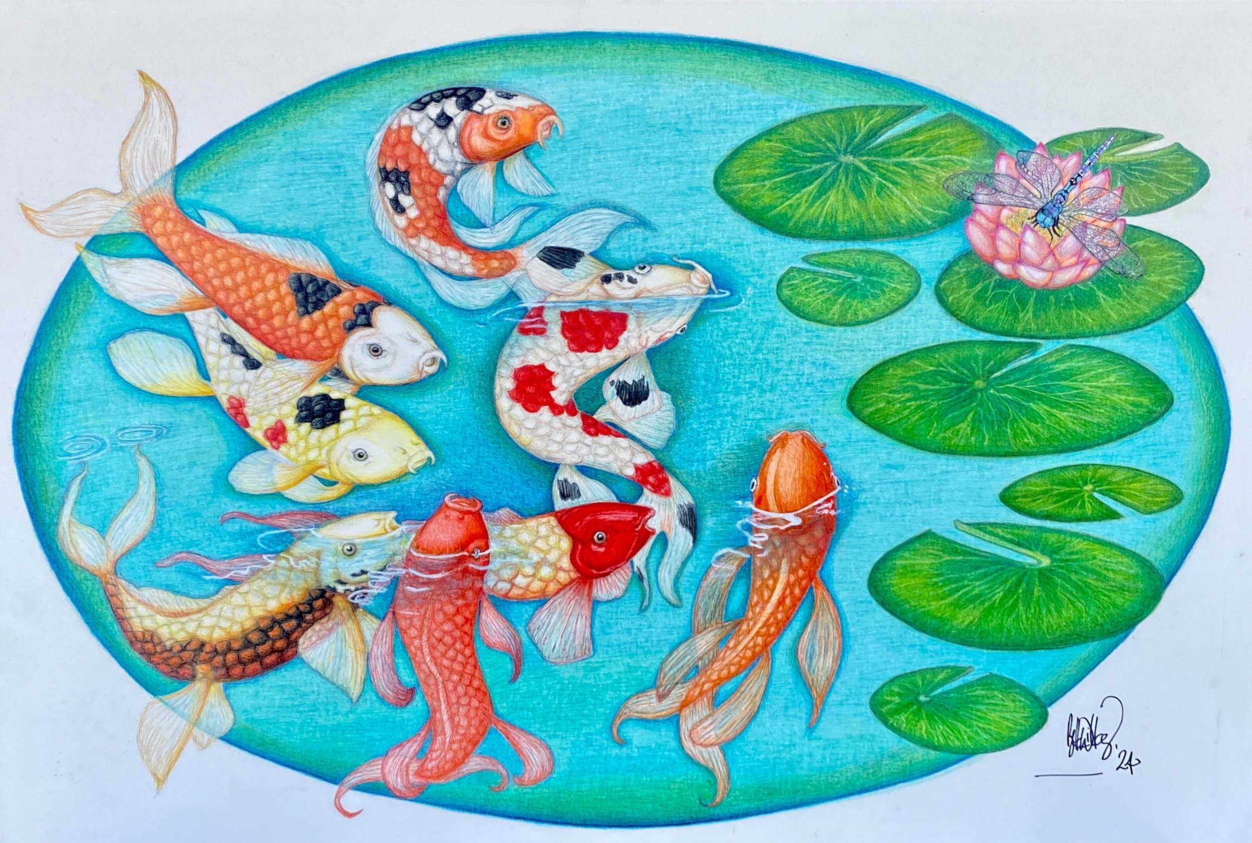 - 8 koi with dragonfly. Feng shui ballet. Graphite, coloured pencil, ink on board. 20×30.