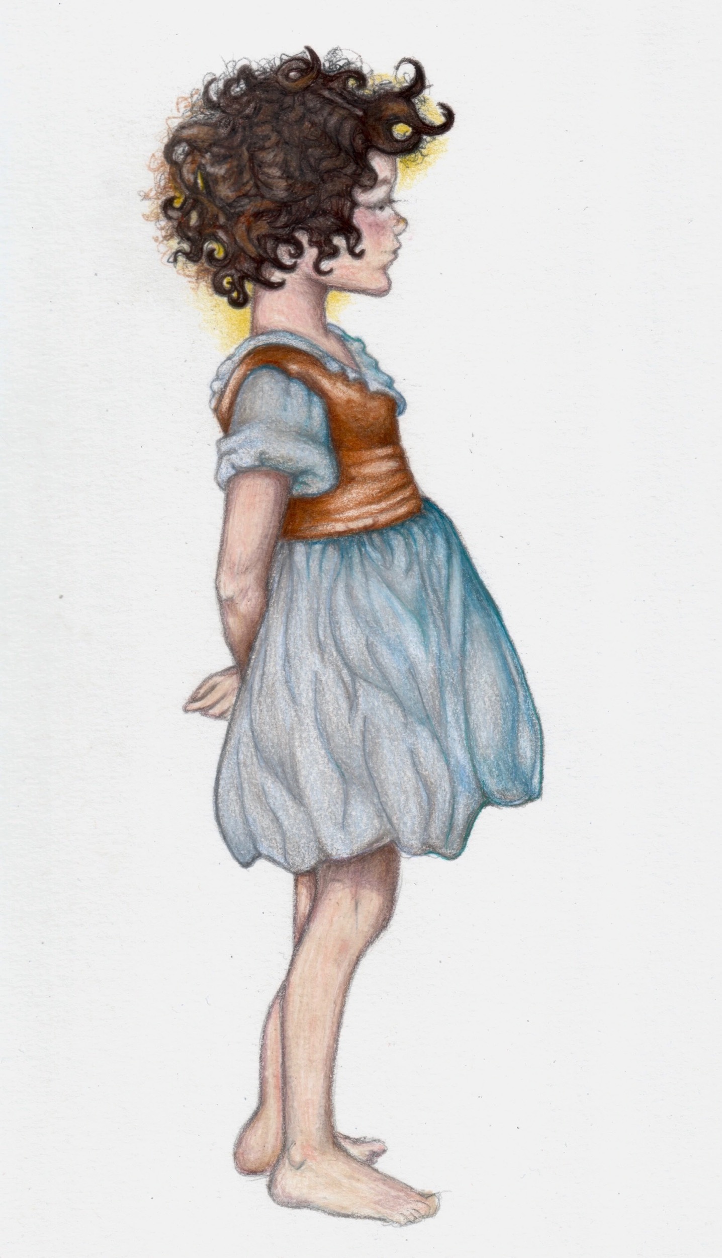 - Heidi #2. Barefoot in traditional dirndl, with goatskin vest, and chambray frock. Graphite, coloured pencil, ink on Bristol board. 9×12.